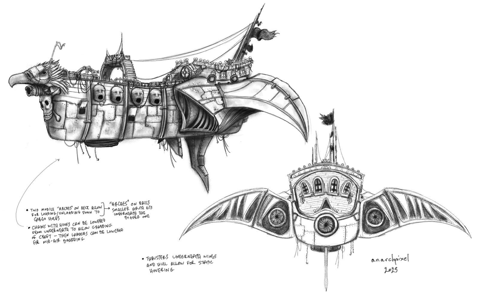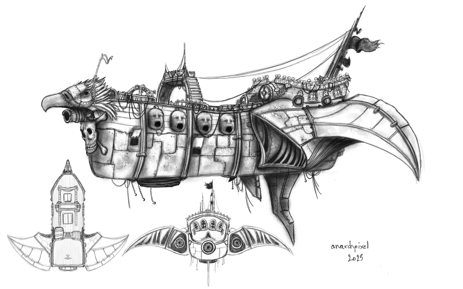 Fast, mid-sized pirate airship, detailed angled side view and rough rear and top down views.